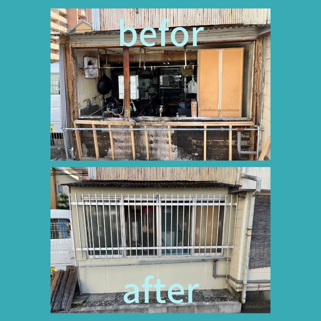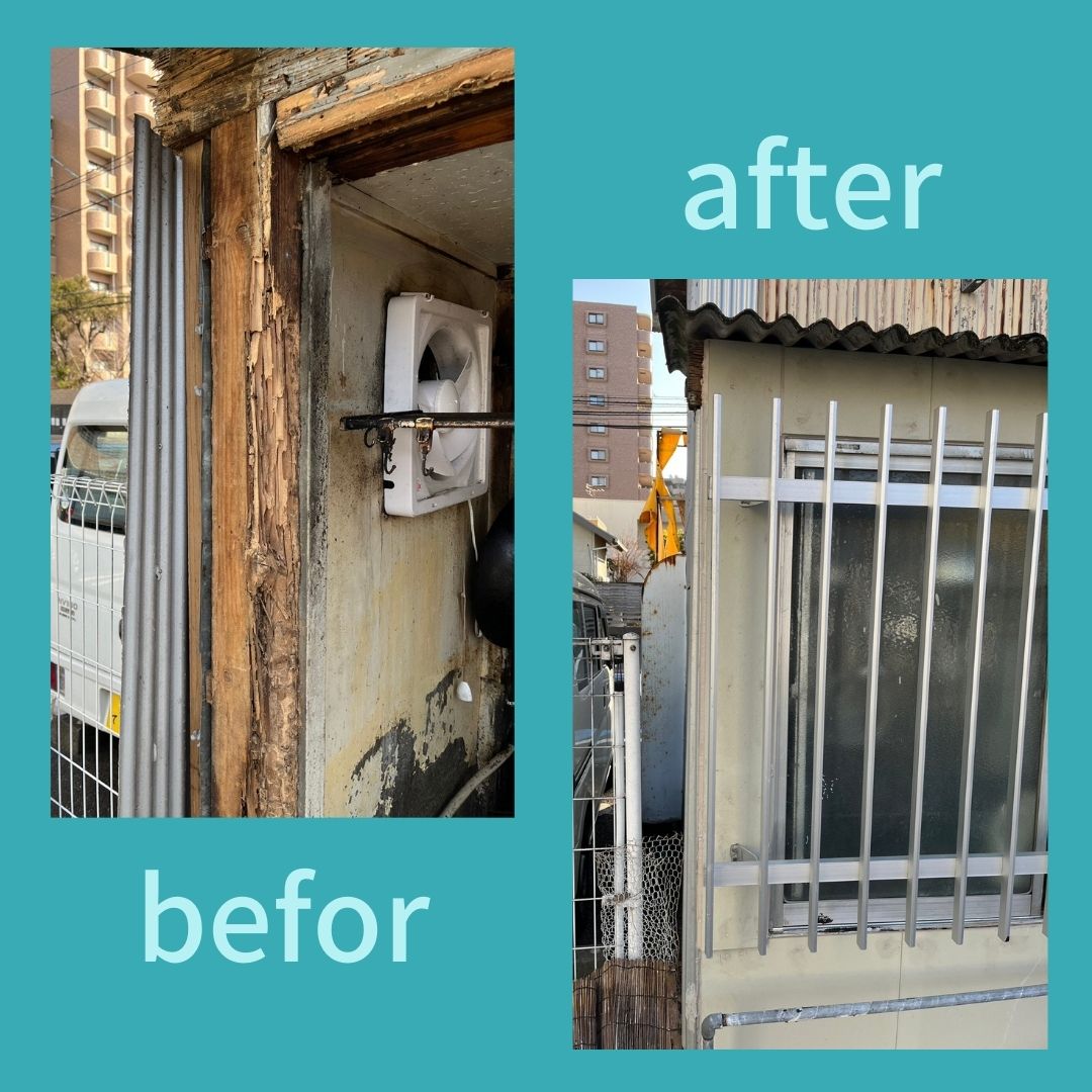 外壁を剥がして、木柱を交換し、サッシを取り付け、外壁材をキレイに新しくしました。