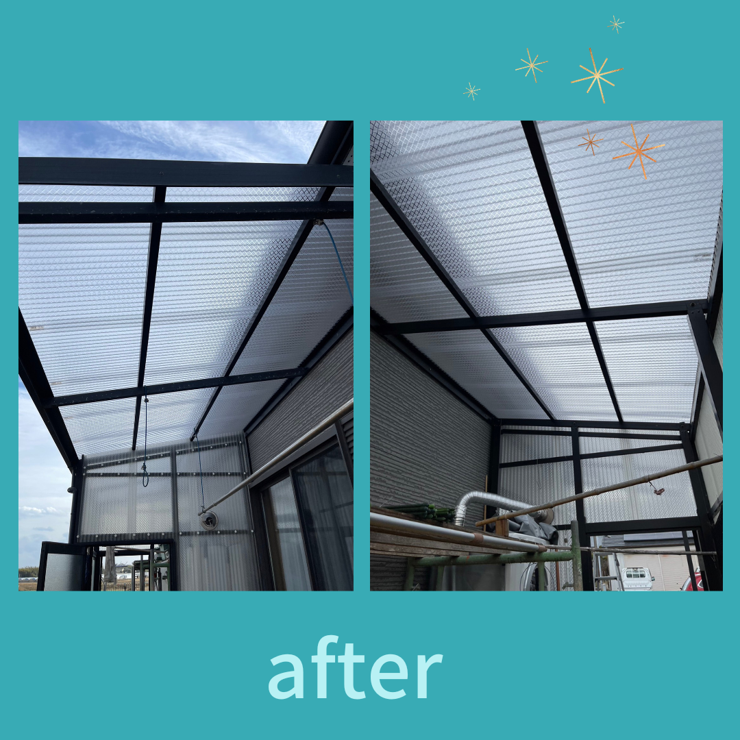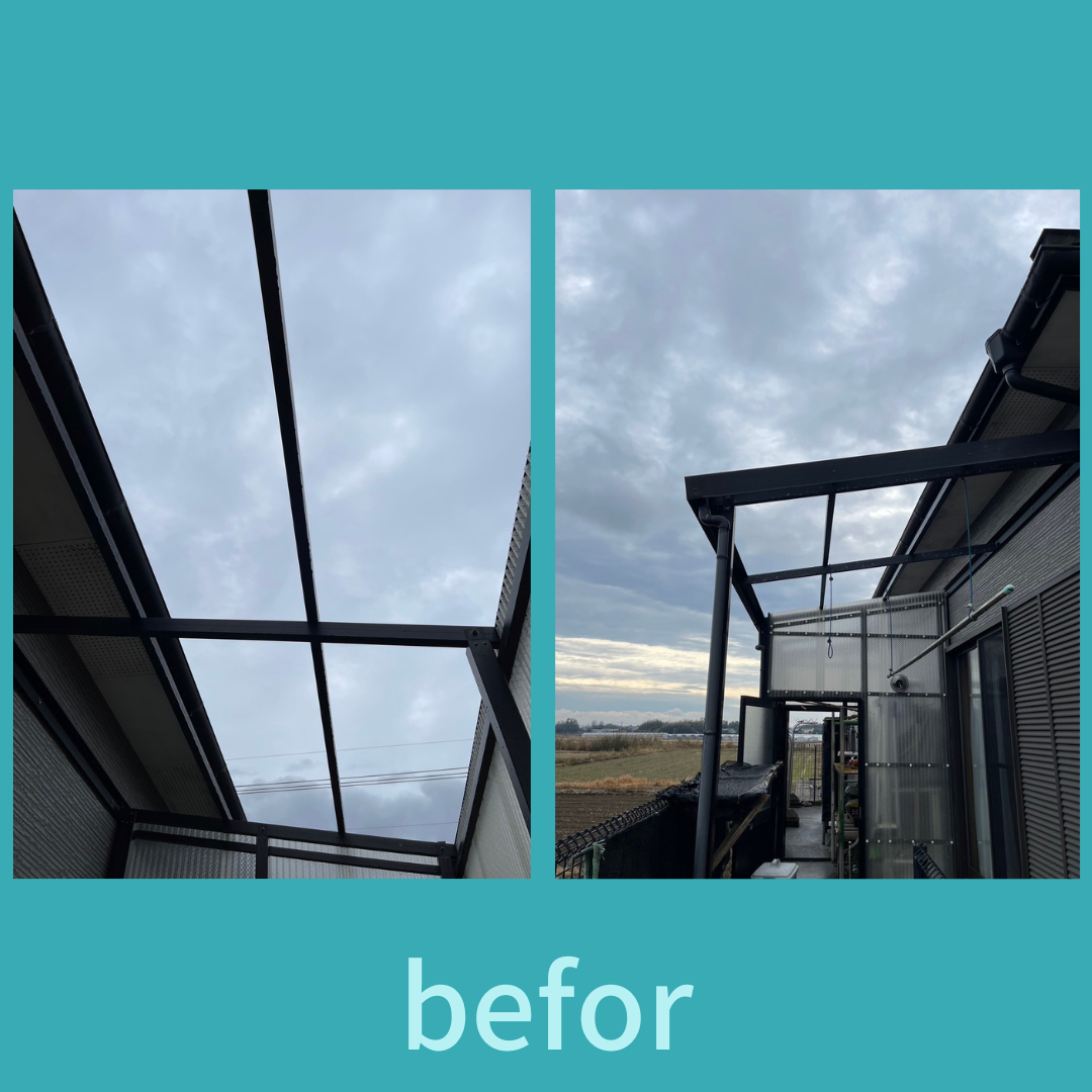 去年の台風で破損した、波板、ガラス割れの補修依頼がございました。