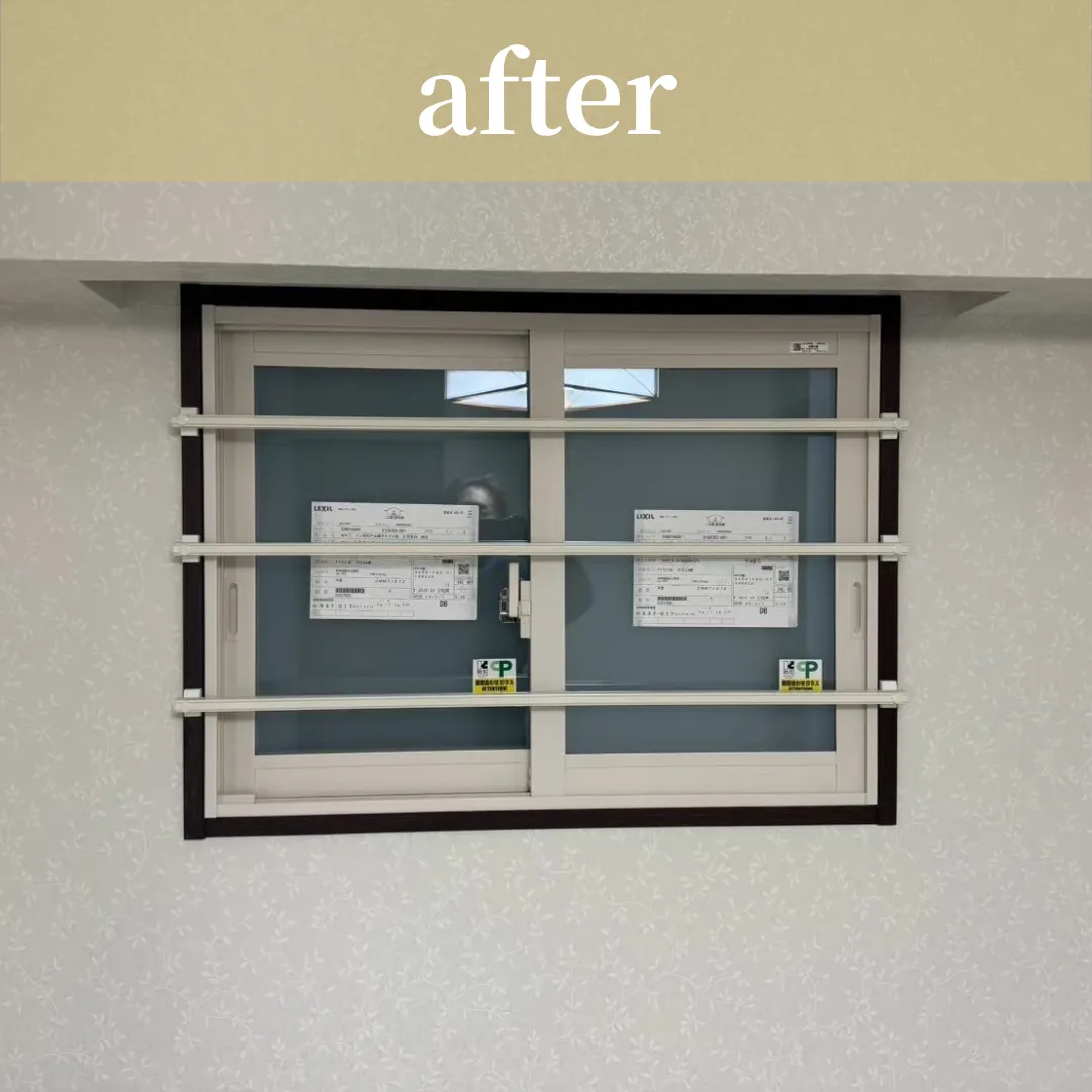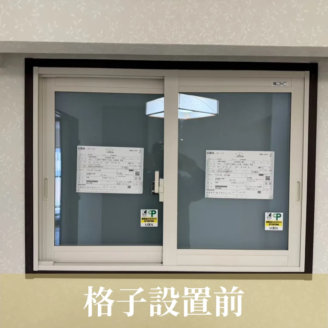 内容③として、腰窓にもインプラスを設置し、その際に防犯のため格子を付けたいとの事でしたが、通常格子は窓外に付けるのですが、共有部に格子はNGとの事で室内側に設置できないかとご相談を受けました💡