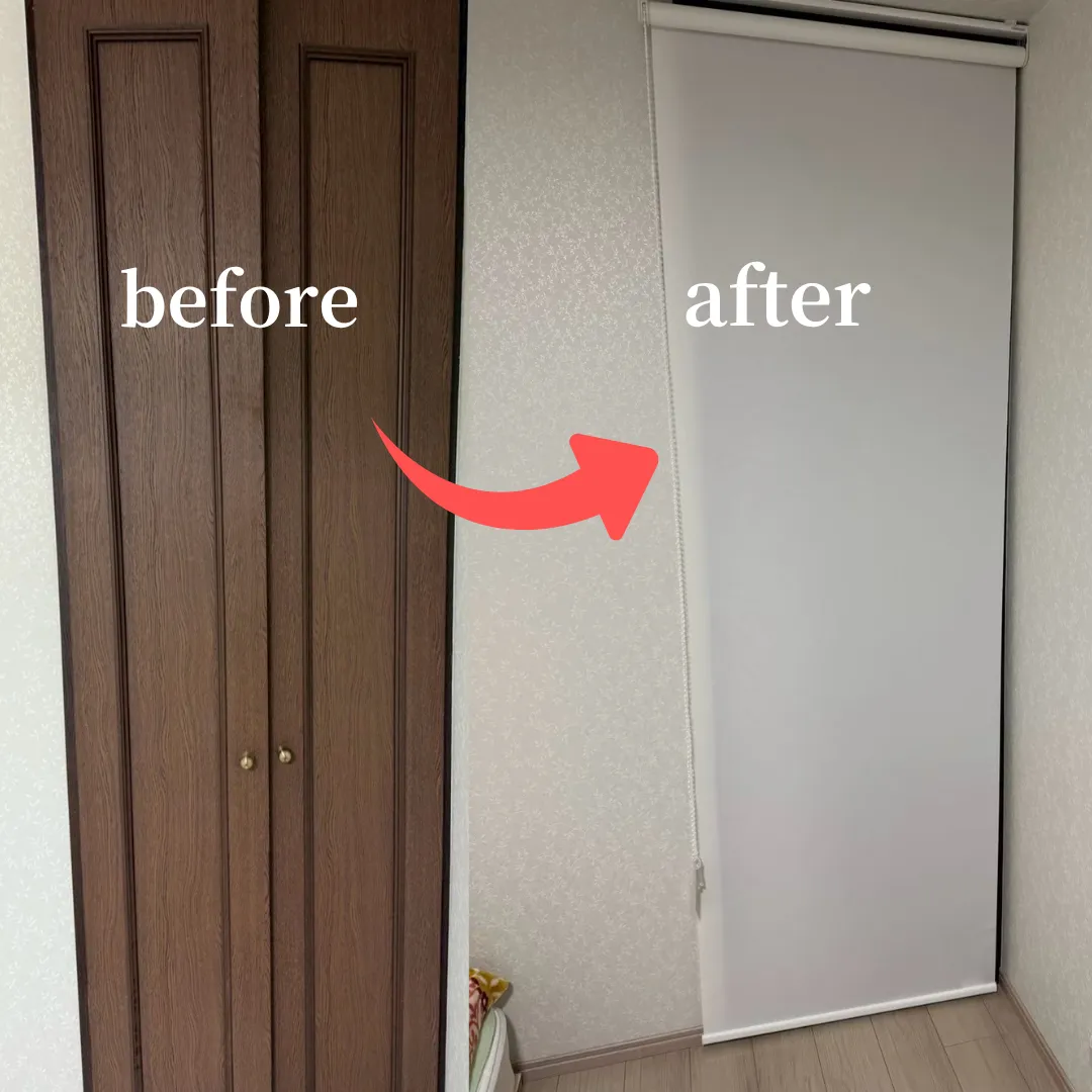 また、収納の扉の開閉ができないとの事でこちらもご相談をいただきました。調査してみると、収納の建具が経年劣化で反りが入っていました。扉を替えると枠ごと取り替えないといけないので、費用も嵩むため、ロールカーテンの設置をご提案させていただきました💡